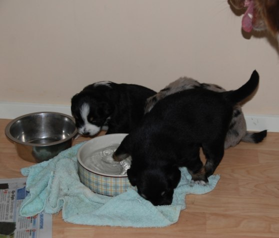 De har börjat få tänder och Trolla blev väldigt glad när de fick lite smakportion på riktig mumma. Valparna var som tokiga i det och hade att göra lång stund efteråt med att tvätta sig...och varandra :)