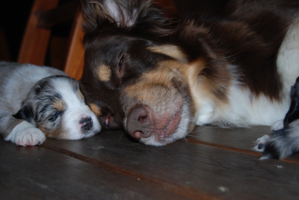 De andra hundarna tyckte nog lite olika om valparna...Ärtan tyckte väl- Urk..såna där! Elvira lite blandning av Ärtans reaktion och ååååh kom så kan jag hjälpa till att dia dig.. Esther hon sa bara -wow vilka små lattjo prylar :)